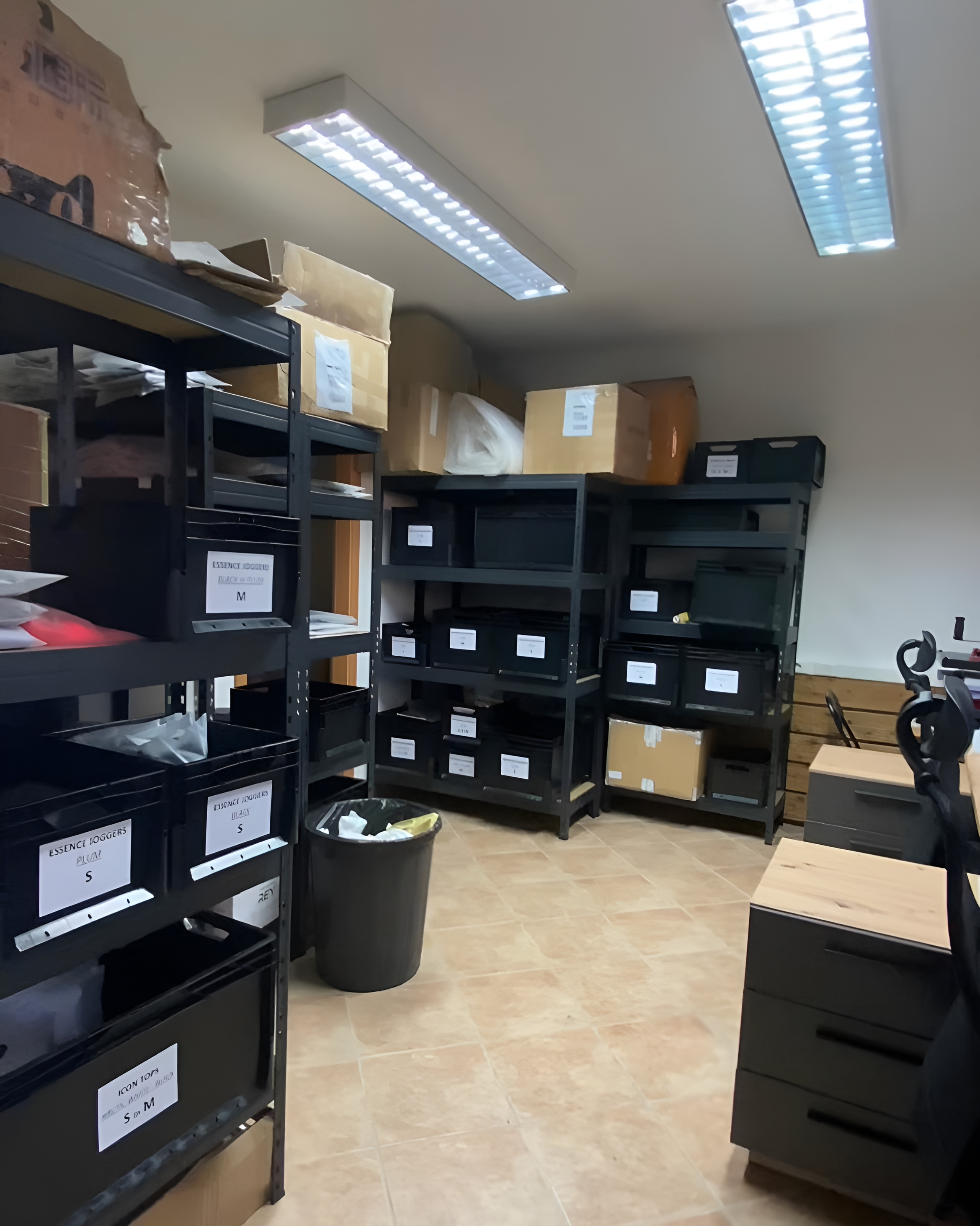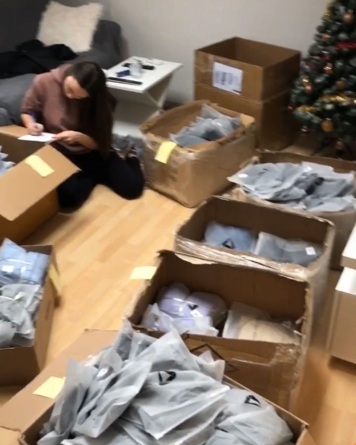 Místo toho, abychom si koupili auto, jsme vložili všechny naše úspory do prvních zásob Aeon Athletics a udělali skok v úplně jiný svět. Z našeho bytu se rychle stalo skladiště, které se den ode dne rozrůstalo. Takto vypadal obývací pokoj na Vánoce 2020.